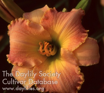 | Description : diamond dusted cream pink blend with gold edge above bright green throat | |