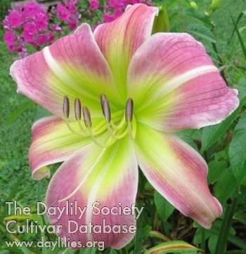 | Description : cream white with huge green throat that extends well out into the petal | |