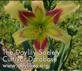 | Description : fleshy cream with a patterned eyezone of blue, violet and maroon on both petals and sepals with a very green throat | |