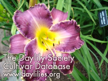 | Description : Purple with cream watermark blending into a yellow green throat, cream and gold double edge. | |