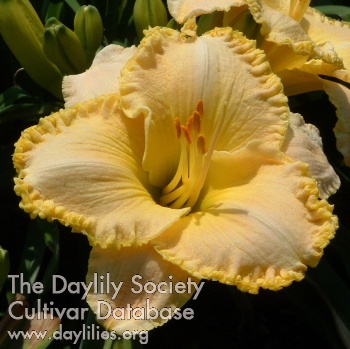 | Description : coral blend with copper eye and ruffled edge above yellow throat | |