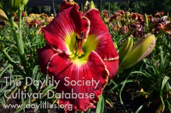 | Description : Deep red with watermark, green throat, and a yellow ruffled edge. | |