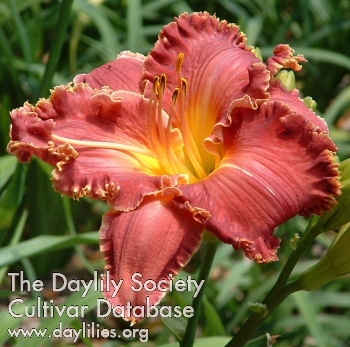 Description : red cranberry with lighter halo and heavy orange gold edge above yellow throat